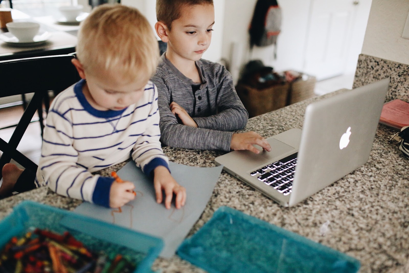 The boys definitely need help (especially B with coding), so I’m always right there to help and guide since they sit right up at the kitchen counter. It’s also a good system to force me to cook dinner every night since I’m right there in the kitchen helping them anyway, so might as well make something 😉