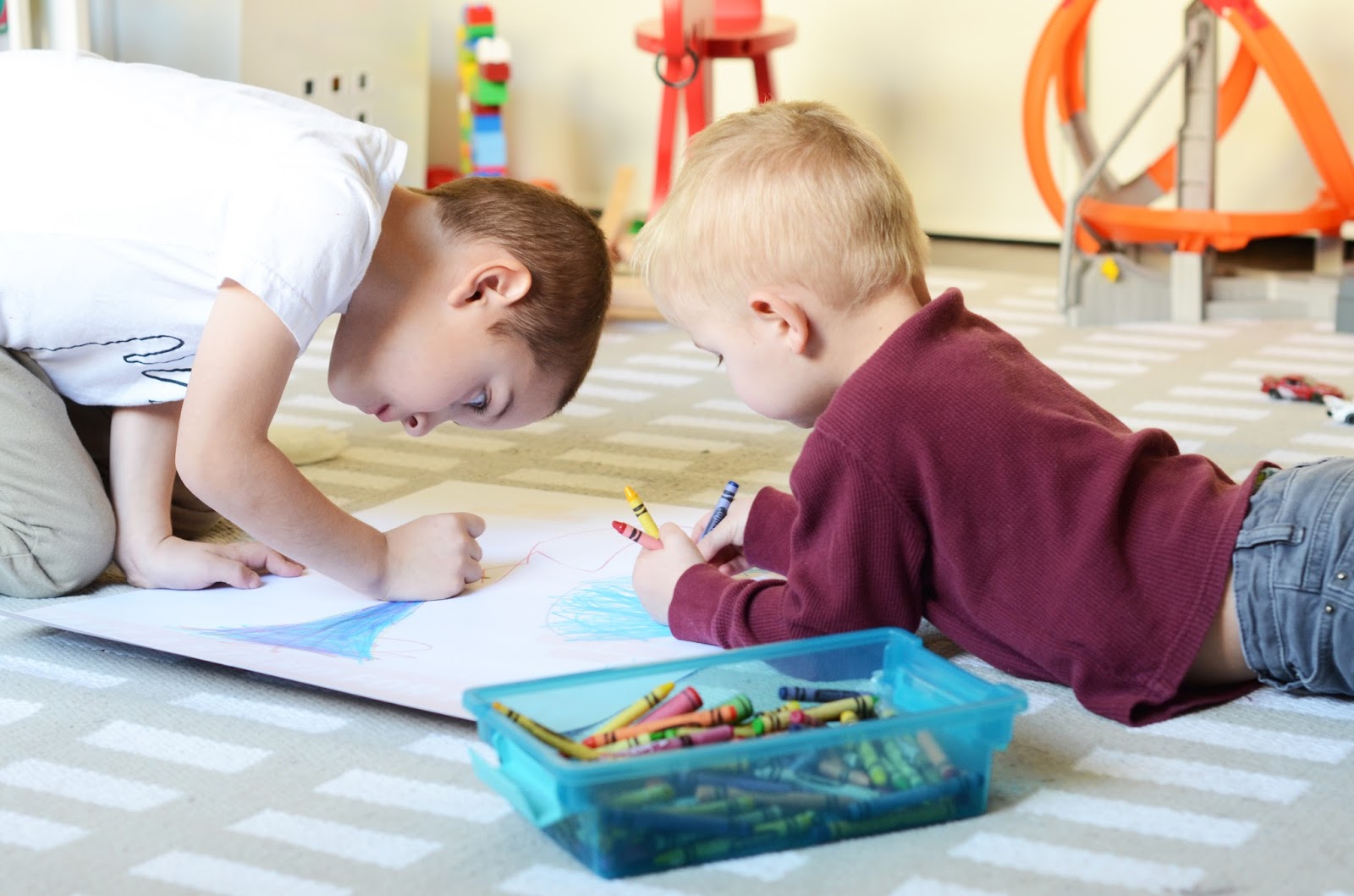 3:30pm: Once they’re done with their snack, it’s time to start quiet time. This is a full ninety minutes of them playing on their own, and my time to work. They usually play together, but if they’re not getting along then they play separately in their rooms. They mostly build with legos, but they also play cars and imagination games. Also I should mention that I do have to run downstairs to help Fos go to the bathroom, and occasionally they come up to my office and want to show me something they’ve built, but for the most part they know they need to stay in their rooms and that I’m pretty off-limits for these 90 minutes.