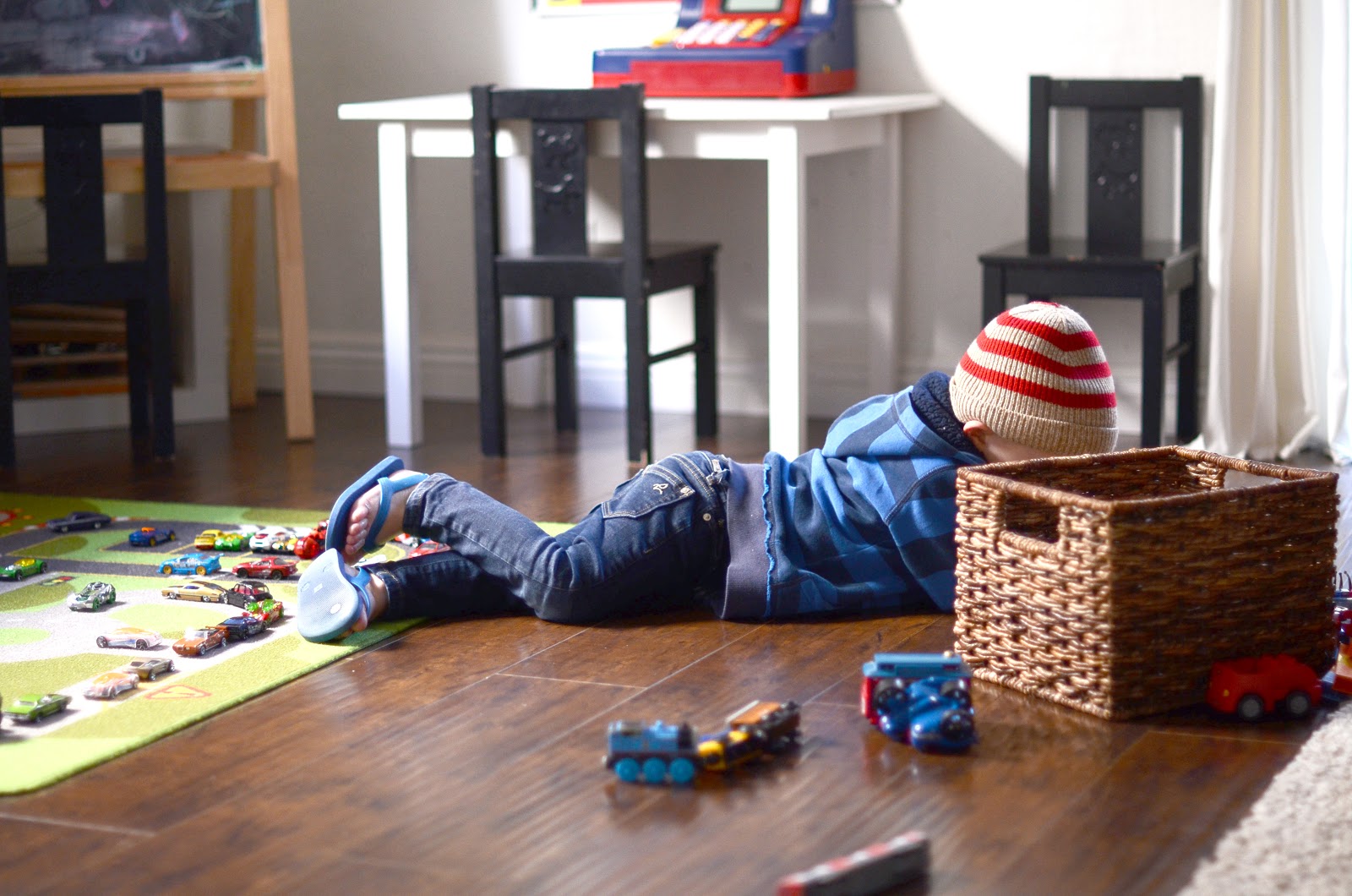 9:20am: I pull out the basket of cars and bring them up to my room so Fos can play while I get ready. I take a shower and then do my hair and makeup. Fos loves this morning time on his own when B isn’t there to steal his favorite cars, so he happily plays by himself, telling stories about the cars and driving them around on the rug and the wood floors.