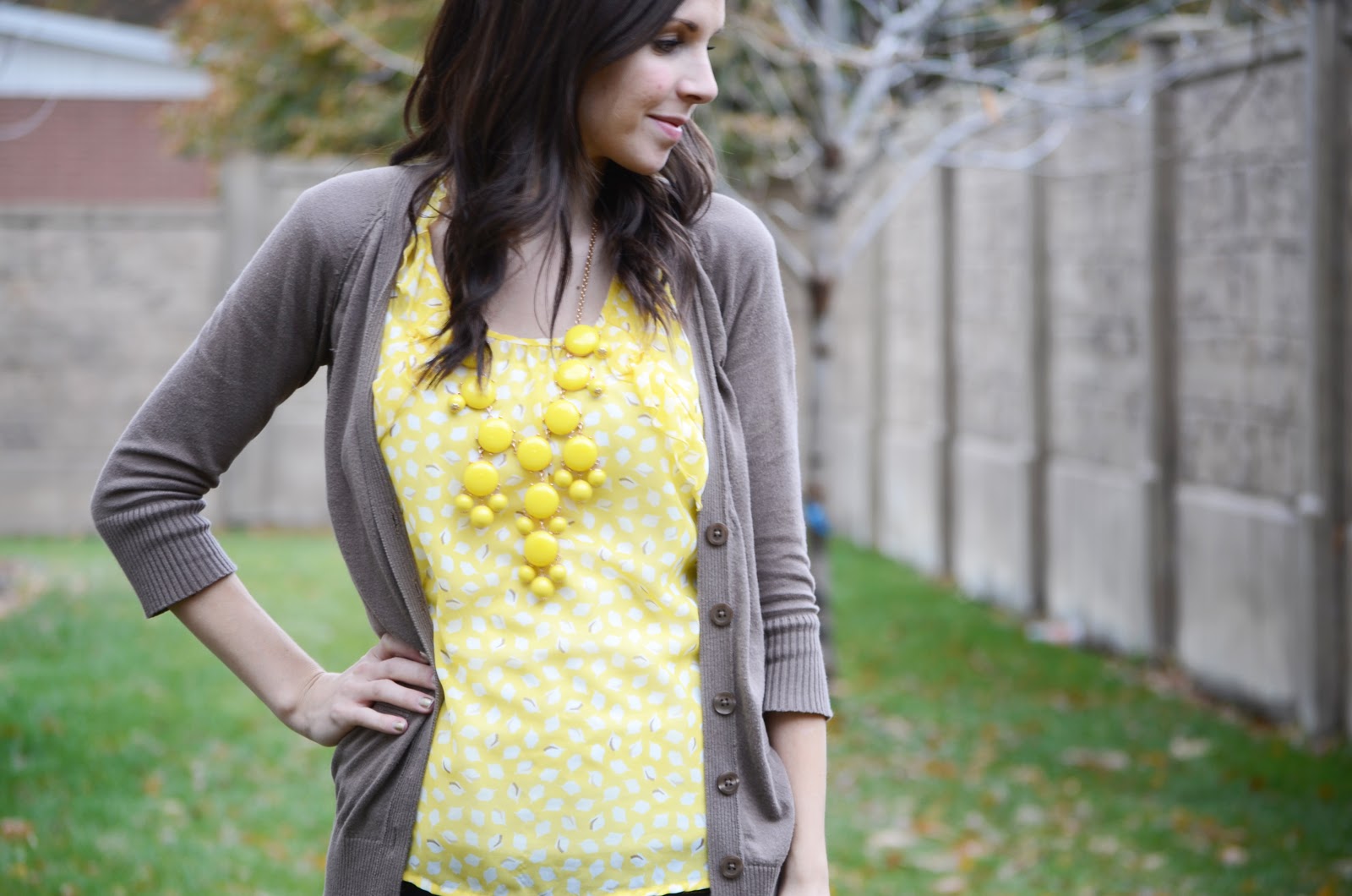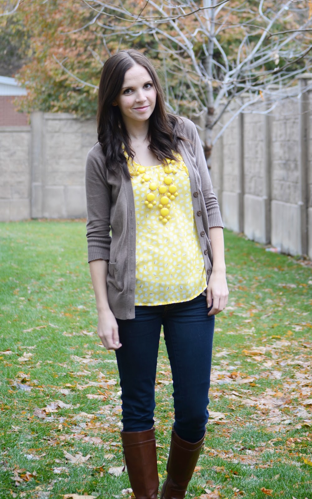 Congratulations on baby #2! He looks so very sweet all wrapped up 🙂 The first thing I thought when I saw this picture pop up in my email was, "I'm missing yellow in my closet!" now I know what color to look for on my next clothes shopping adventure! This outfit is super cute, and a perfect post-baby body choice.