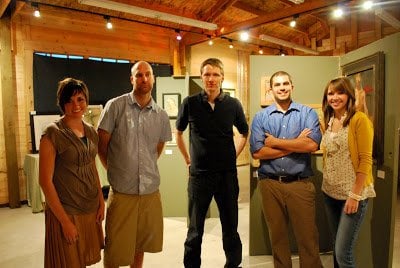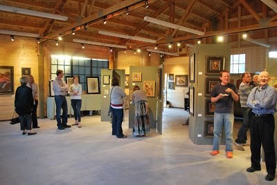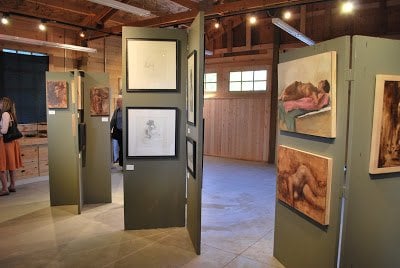 [Gallery space #1 -- The Carriage House] [four of my tiny paintings straight ahead in the black frames (two stacked on the left and two stacked on the right)] [six of my pieces] [gallery space #2 -- Santiago's barn/studio] [two of my figure pieces (the top two)] [five of the six of us (from L …