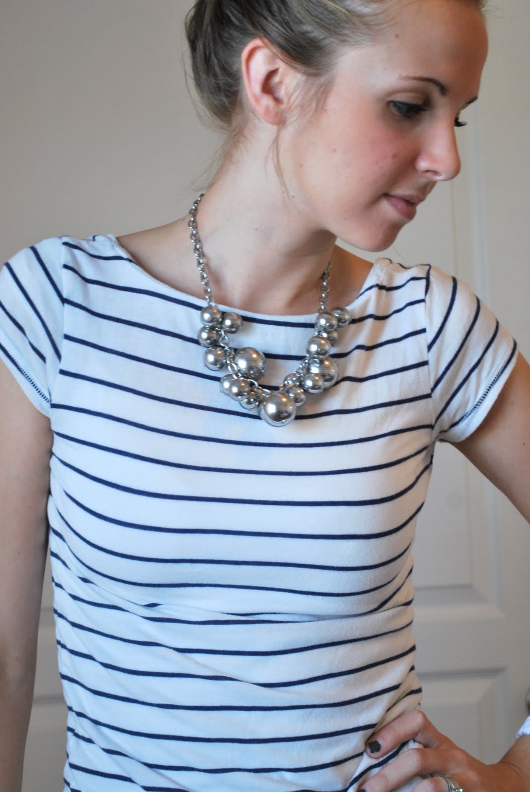 This striped tee was a must-have when I saw it on the shelf at Target. All my other striped clothing is more dressy, so having a navy and white striped casual tee was just what my closet was wanting. Then, the second time I wore it, I got a nice orange stain two or three stripes below the neckline. I tried stain remover and bleaching over and over, but to no avail. Finally I bought a white fabric marker and went at the stain with that last night, but because the shirt is actually slightly off-white, the white paint was too obvious.