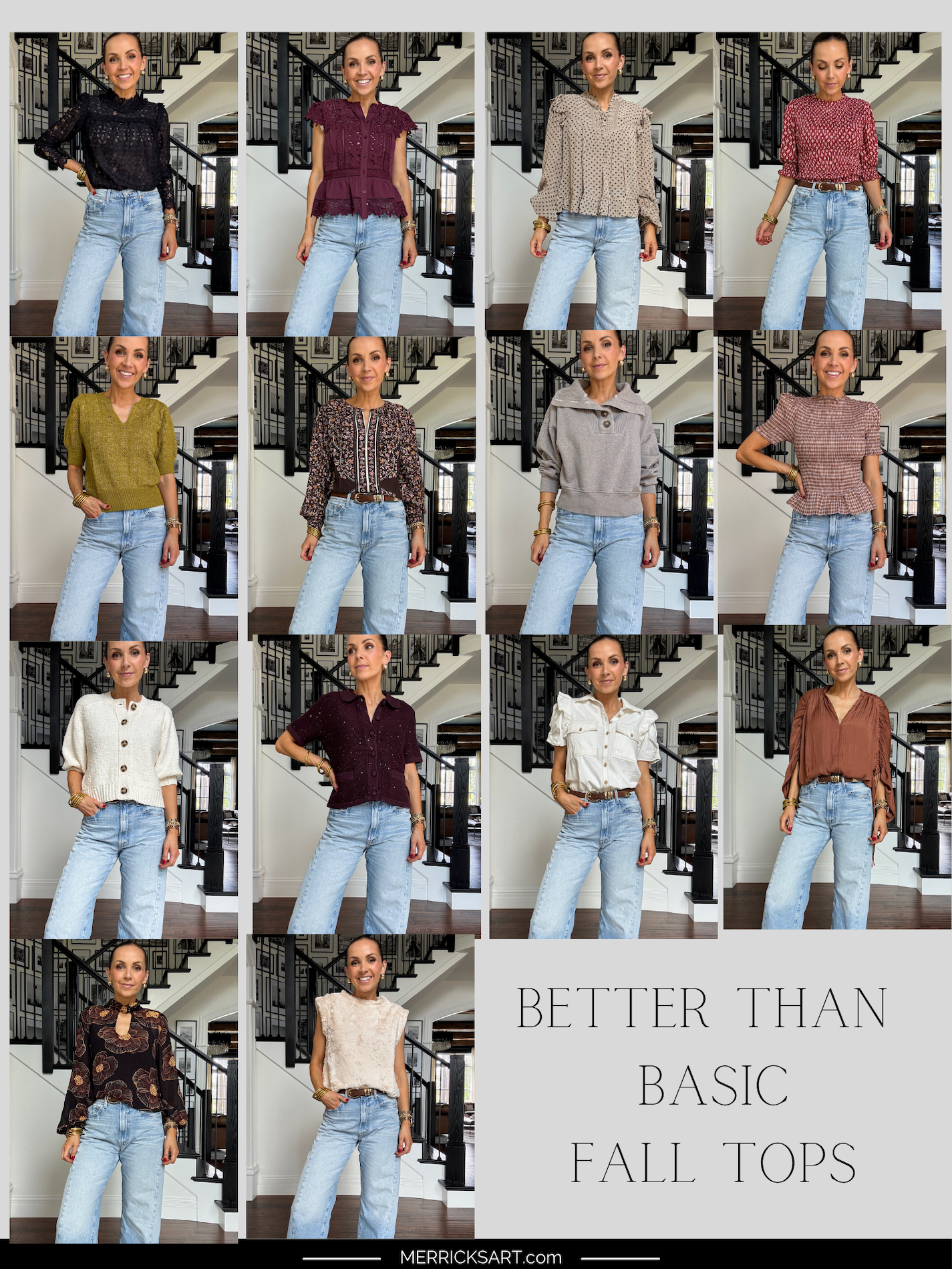 If you’re stuck in a basic tee rut this fall and need some help, today’s post is sharing a bunch of really cute fall tops that are nicer than a t-shirt and better than basic.