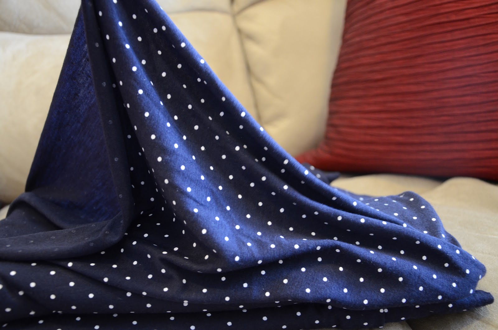 #1. Stretch Rayon Blend Jersey Knit in Polka Dots Navy/White (no longer on the website — I told you things sell out quickly)