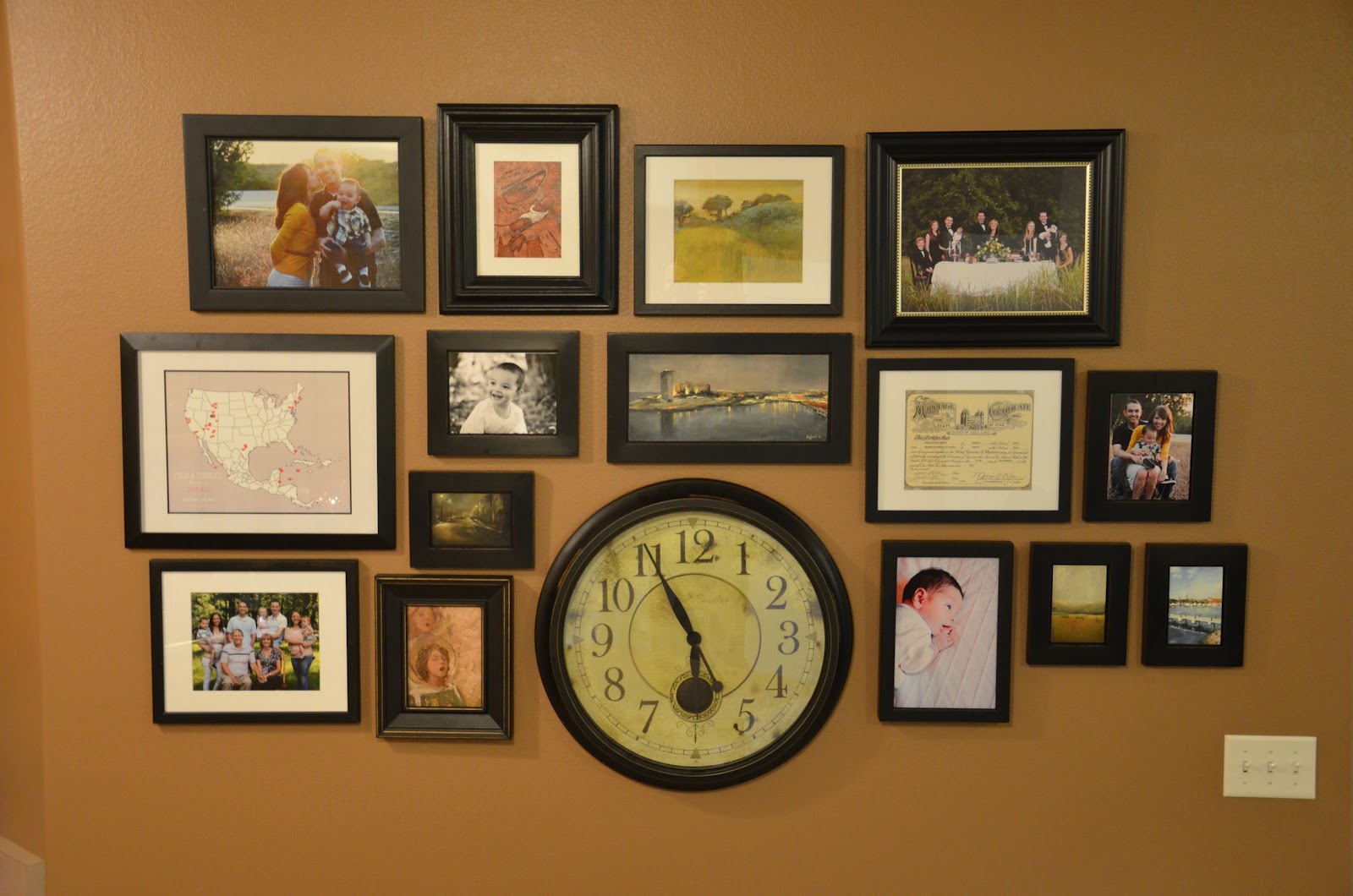 Pretty much all the personal touches around the house are now back up, but I still wanted a large photo wall that could display some of my art, as well as some family photos. We have a large wall in our kitchen that has displayed a big round clock for the last five years, and as soon as I saw this photo on pinterest, I knew that combining a large round piece with smaller square and rectangular pieces was totally doable.