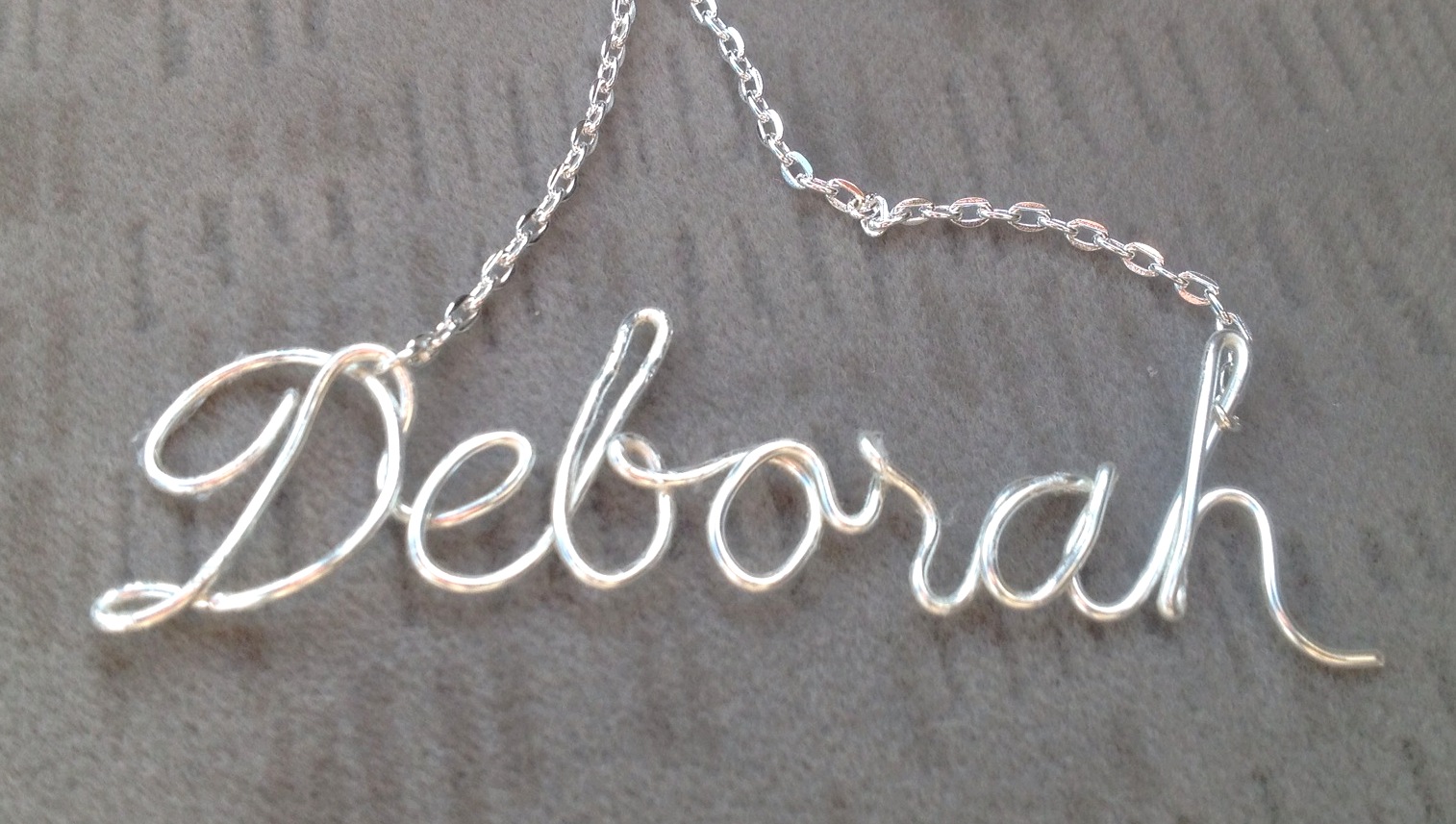 I went through a bunch of fonts to copy before I decided on “Pinyon Script.” It had beautiful letters, but wasn’t too difficult to duplicate. The only deviation I made from Megan’s tutorial was that I bought a ready-made necklace chain, rather than buying the chain and clasp separately. Then I just used wire cutters to cut the chain, then used the jump rings to attach the two cut ends of the necklace to the wire name. Super easy, and I love how they turned out.