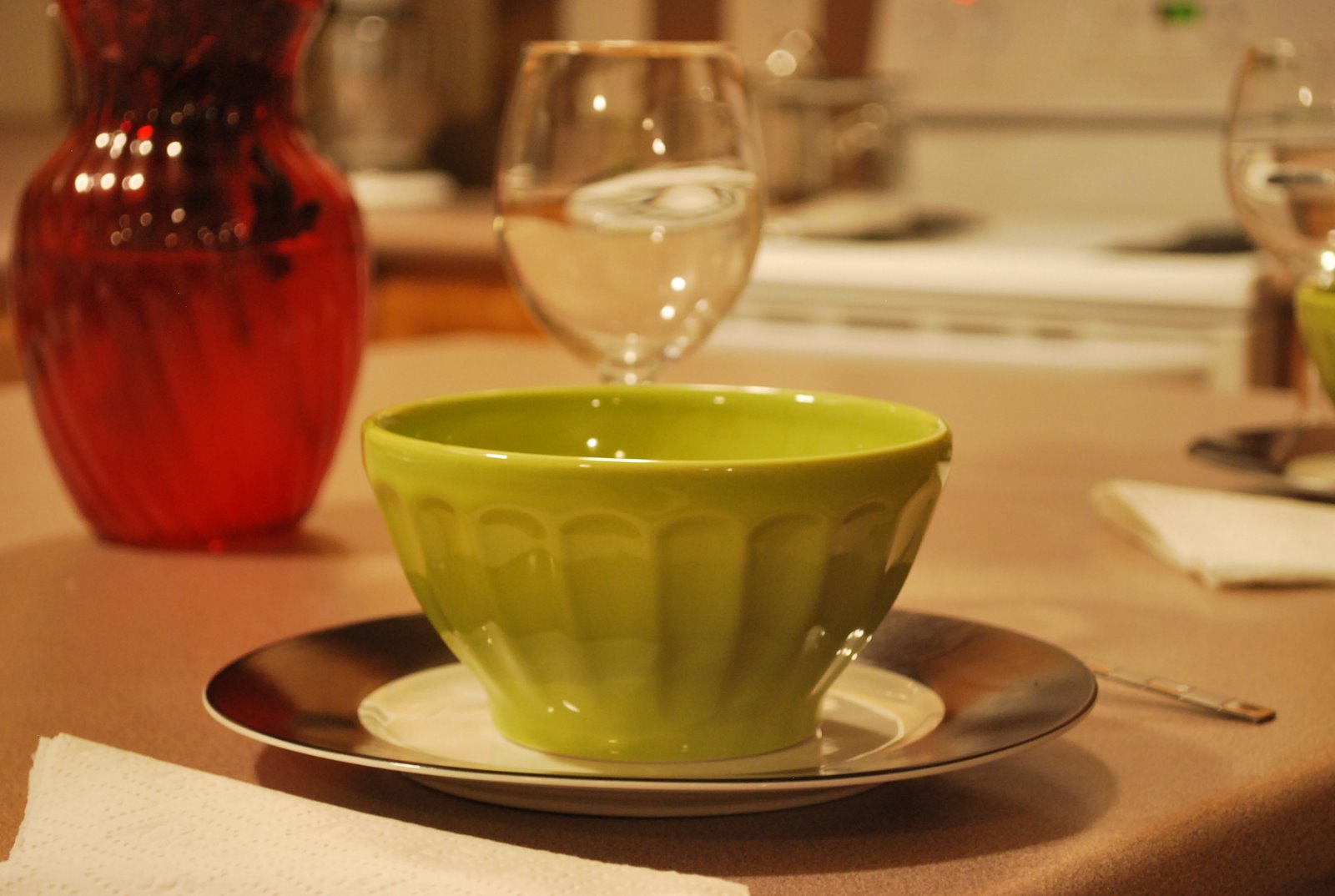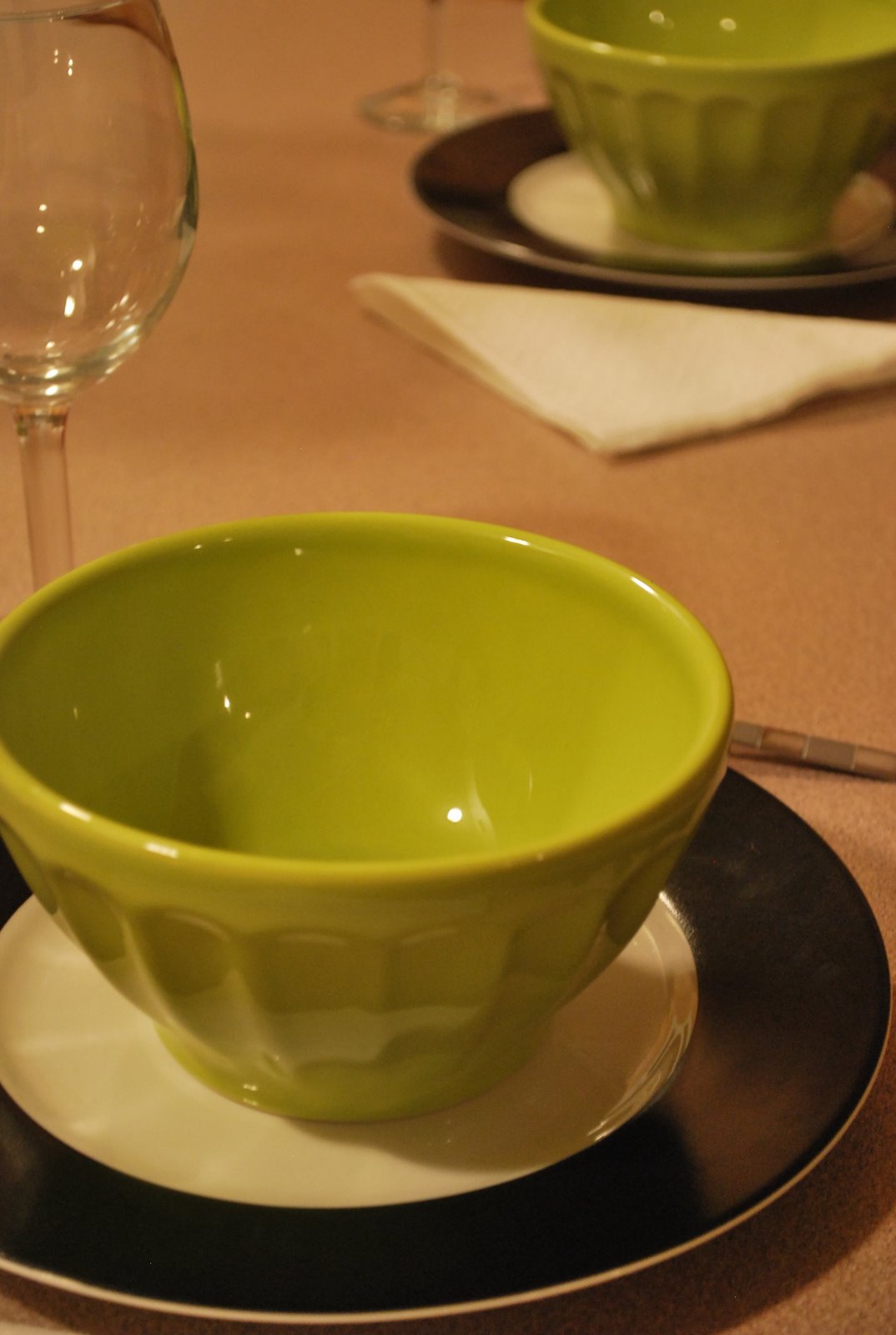I got these gorgeous green Anthropologie latte bowls for Christmas from my mom. Paired with my Dollar Tree goblets and black and white Target plates, the table looked so pretty.