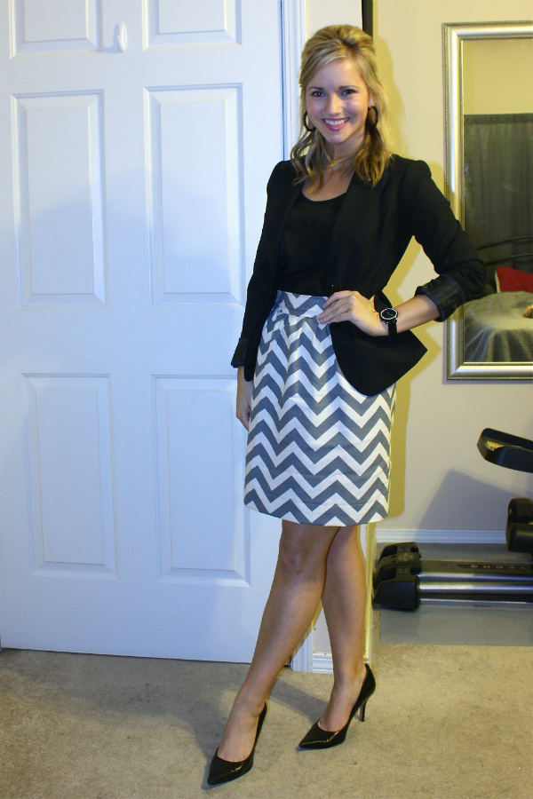 I love the skinny t with the Peter Pan collar! Cute! And the chevron skirt? Swoon.