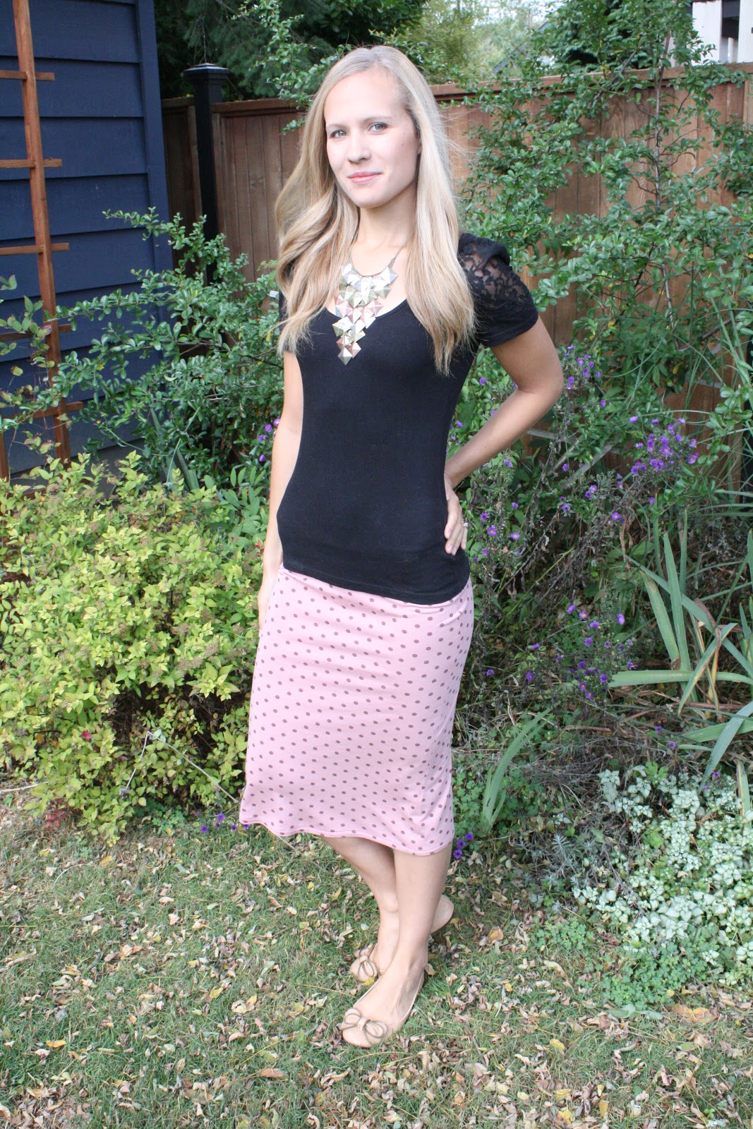 Stefanie’s second project is a jersey pencil skirt she made using my jersey pencil skirt tutorial. So cute!