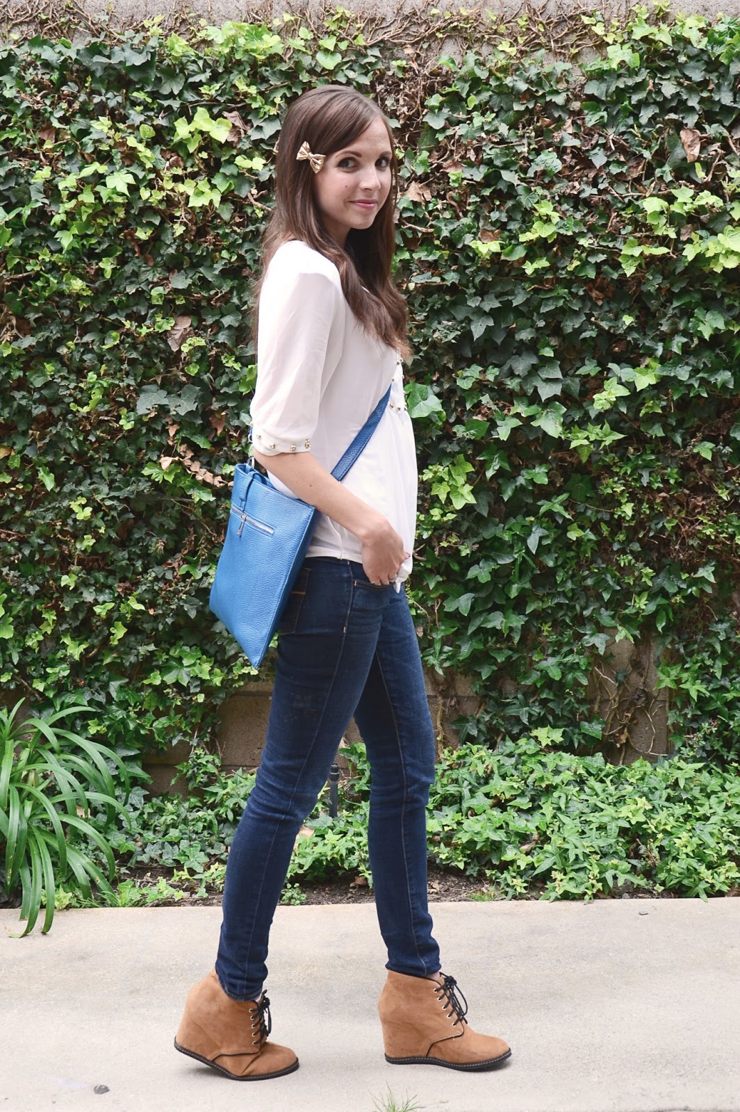 As a mom, running errands, chasing a toddler, and getting spit up on are daily activities, so I rarely have need for fancy outfits. Most days, jeans and a top are my uniform. But make those jeans fitted and cute, wear a top with a little bling at the neckline and arms (plus a pretty scooped hem), add a pair of fun wedges and a darling bow clip, and suddenly a really simple outfit is anything but plain.