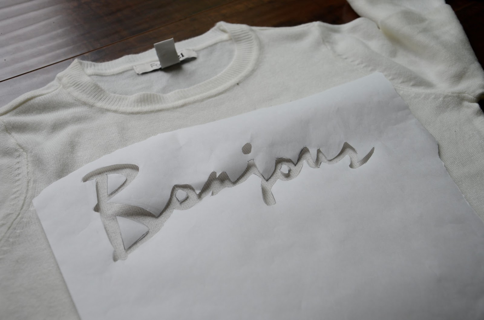 With a super plain sweater I bought a few months ago from Forever 21, and a freezer paper stencil, I pumped this baby out with only moments left on my one-hour clock. To be fair, drawing and cutting out the letters took the majority of my time — the actual painting took one minute at the most.