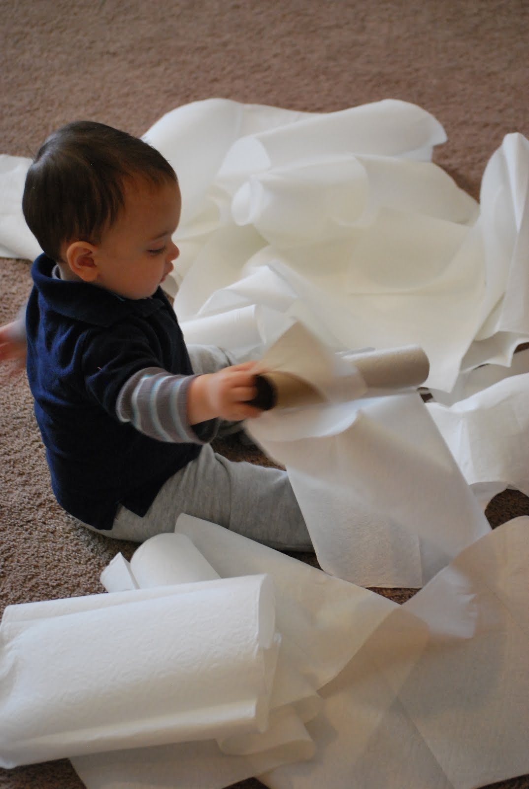 So cute. Let him play with the plastic ware, pots and pans, etc. Keeps little ones occupied, and they are easy to clean up later.