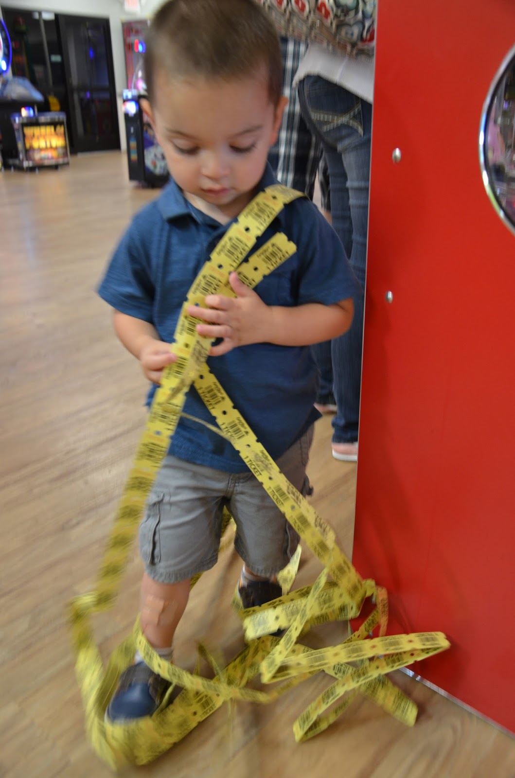 Afterward, we let the kids run around the arcade and play a few games. I gave Peanut a couple of tokens and let him choose a game. Of course he chose the one with the worst odds, threw his tokens in the slot, and suddenly two hundred tickets came pouring out! He was thrilled, and turned them in for a little stuffed dog.