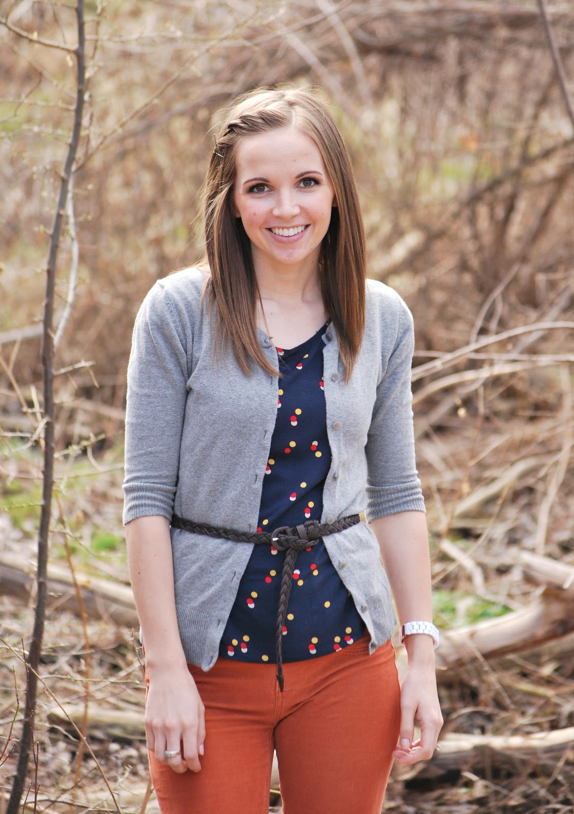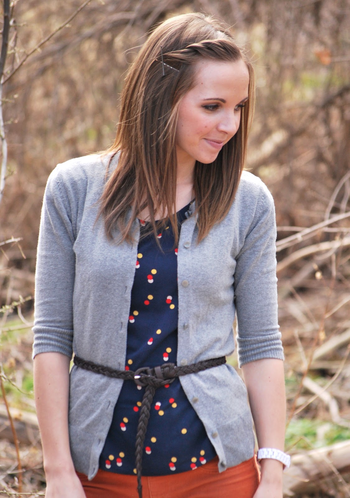 Very cute look today! Love the navy-orange-grey mix! And your hair looks fab like that! Have a great weekend!